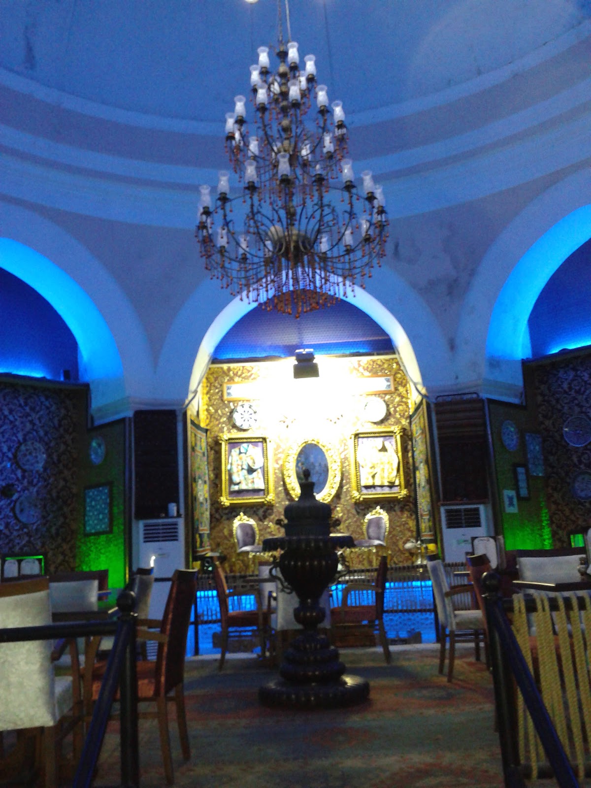 | Teman order segelas cay panah, masa tu tangan dah beku. Sambe tu mater memerhati deko restoren nih, klasik dan penuh ciri-ciri Uthmaniayah! Kat gelas cay tu ialah lampu pelita pesen lama! |